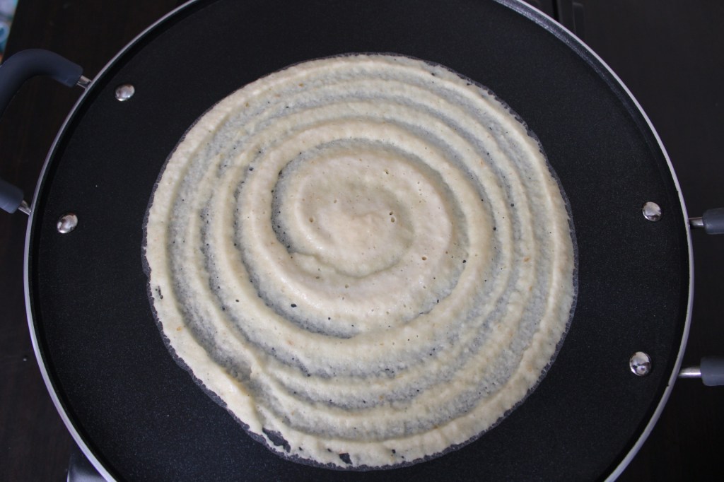 - Heat the dosa pan, Ladle some batter into the pan in the middle. Use your ladle to rotate in a circular motion of the batter adhere to all over the sides of the pan.