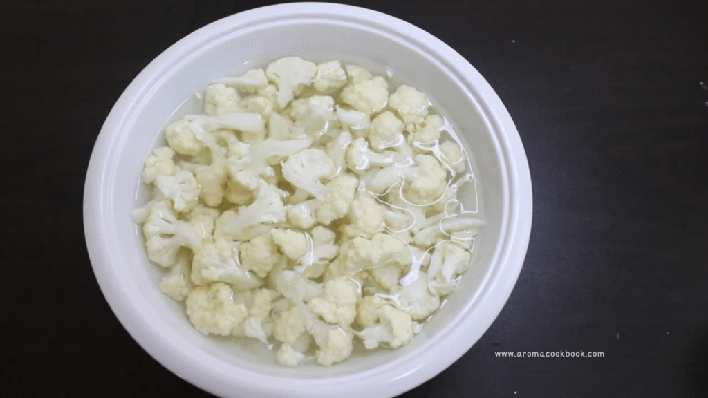 - Blanch cauliflower florets in salted hot water for 5-10 minutes. Drain the water completely.