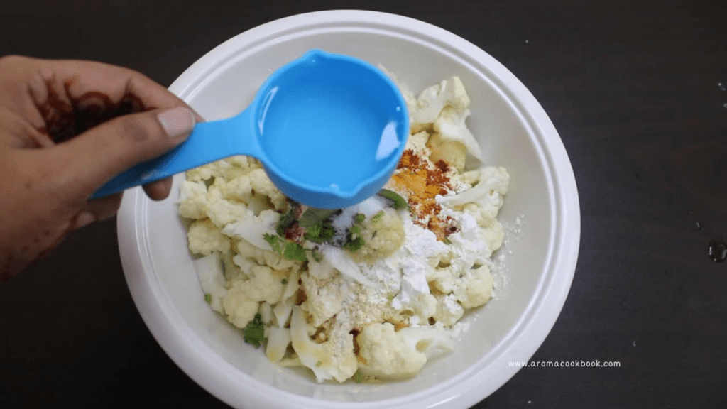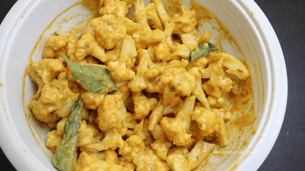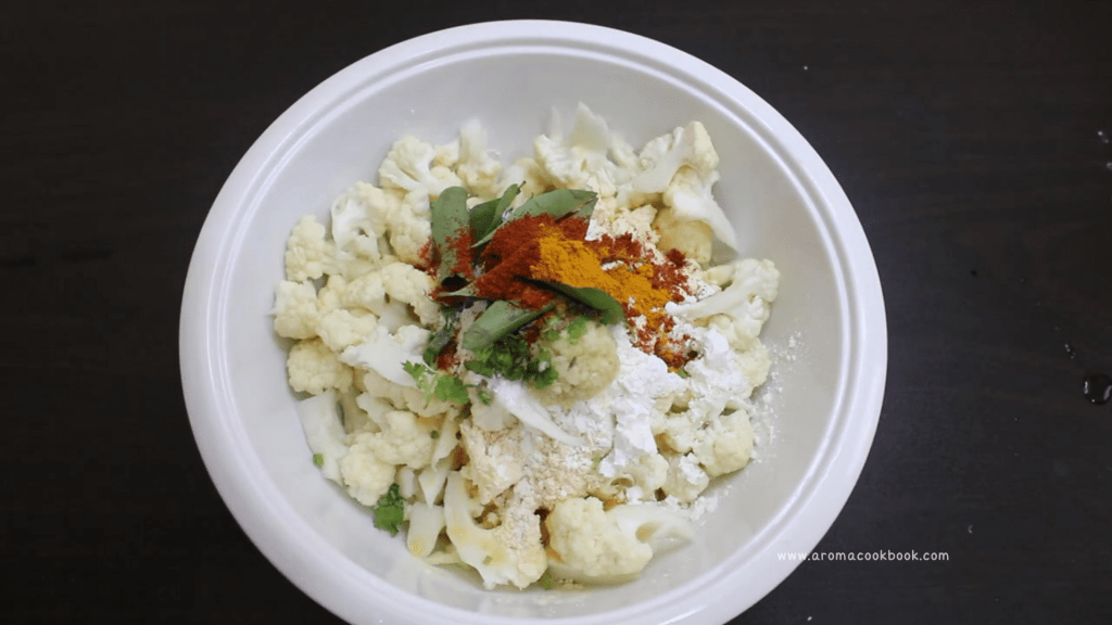 - Transfer cauliflower florets to a mixing bowl. Add all the ingredients and mix well