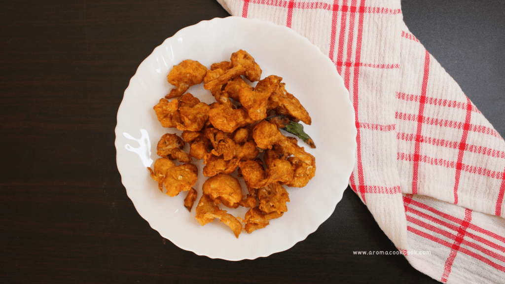 | Cauliflower florets Gram flour Rice flour Corn flour Cumin seeds Ginger & Garlic Coriander Leaves Curry Leaves Chili Powder Turmeric Powder Salt -as you taste Water Cooking oil | 2 cups 4 tablespoon 1 tablespoon 1 tablespoon 1/2 tsp 1/2 tsp 1 tablespoon 8-10 1/2 tablespoon 1 /4 tsp 1/4 cup For frying |